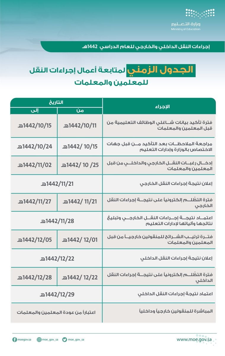 1. الجدول الزمني لمتابعة أعمال إجراءات النقل للمعلمين والمعلمات