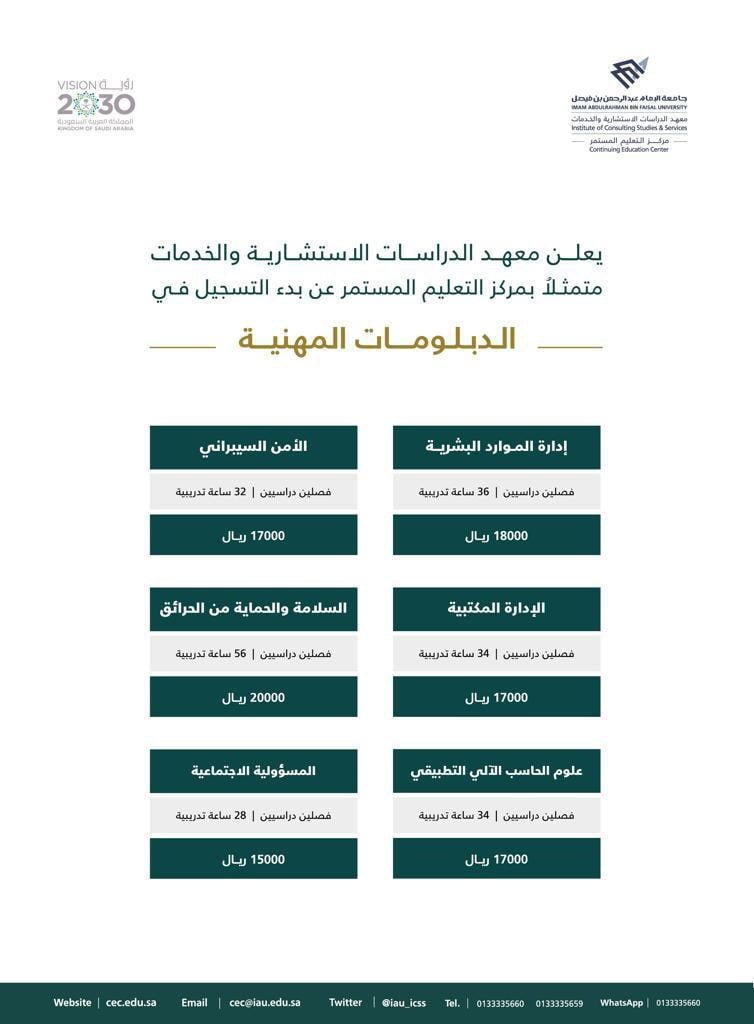 أعلنت جامعة الإمام عبدالرحمن بن فيصل مُمثلة في معهد الدراسات الاستشارية والخدمات بدء التسجيل في الدبلومات المهنية رجال / نساء .
