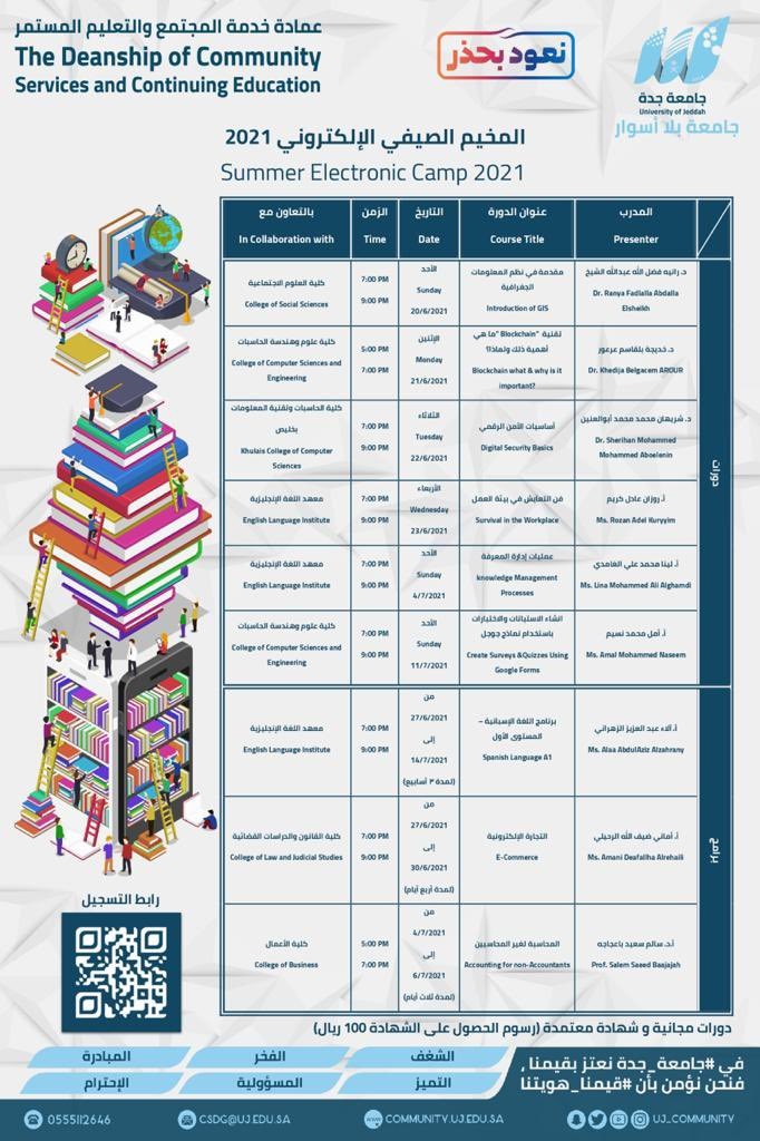 أعلنت جامعة جدة مُمثلة في عمادة خدمة المجتمع والتعليم المستمر عن انطلاق المخيم الصيفي الالكتروني 2021م، الذي يتضمن عدد من الدورات والبرامج التدريبية التي تساهم في صقل مهارات الفرد المعرفية والعملية .