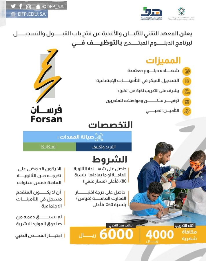 أعلن المعهد التقني للألبان والأغذية فتح باب القبول والتسجيل في برنامج الدبلوم المبتدئ بالتوظيف في شركة فرسان الأغذية.