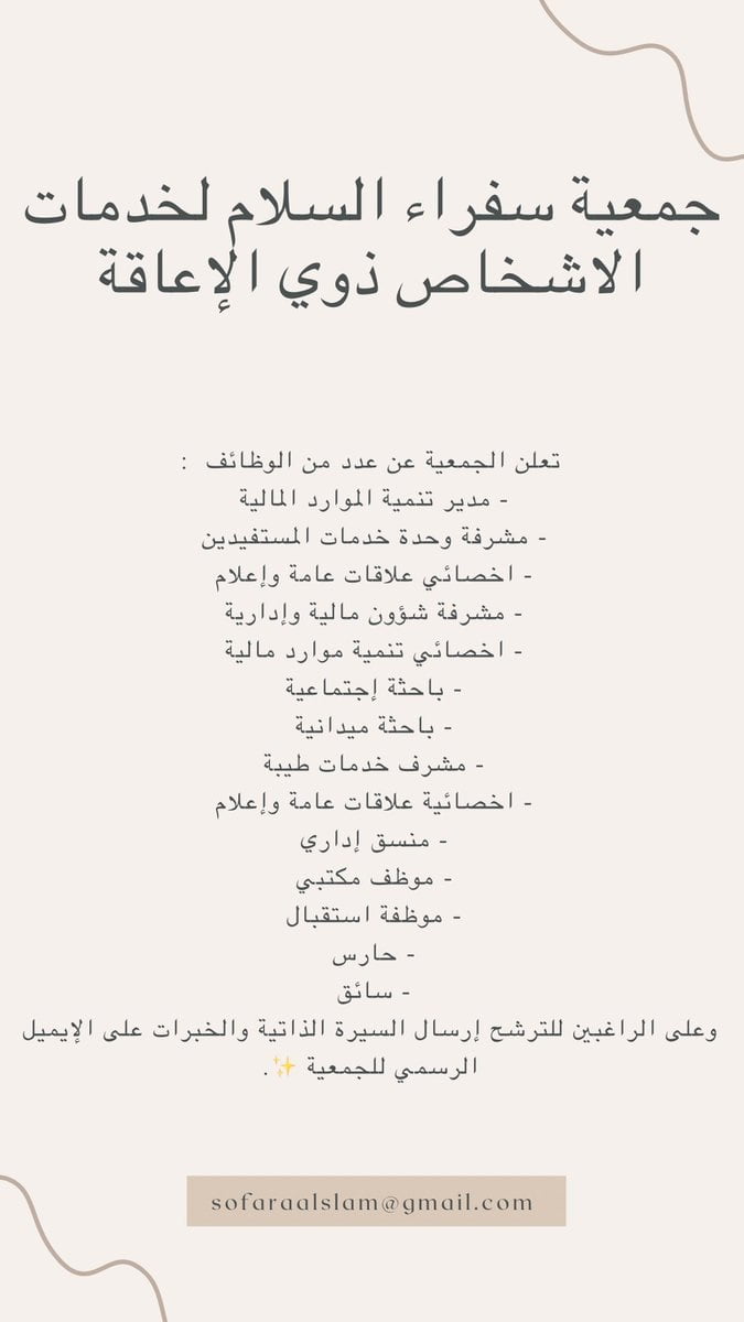 أعلنت جمعية سفراء السلام لخدمات الاشخاص ذوي الإعاقة بمنطقة الجوف عن توفر 14 وظيفة شاغرة للجنسين وذلك حسب التفاصيل الموضحة أدناه: