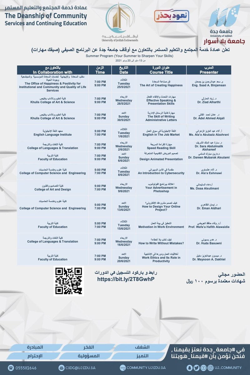 أعلنت جامعة جدة مُمثلة في عمادة خدمة المجتمع والتعليم المستمر بالتعاون مع أوقاف جامعة جدة ضمن المخيم الصيفي صيفك مهارات إقامة دورات تدريبية عن بُعد بعدة مجالات حضور مجاني لكافة أفراد المجتمع.