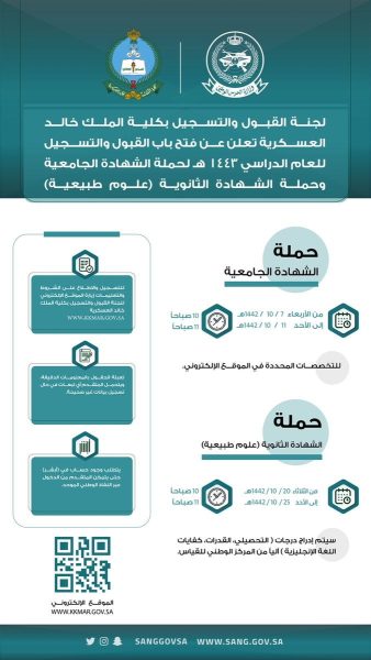 أعلنت كلية الملك خالد العسكرية ممثلة في لجنة القبول والتسجيل بوزارة الحرس الوطني عن دورة الضباط للجامعيين وفتح القبول لحملة الثانوية .