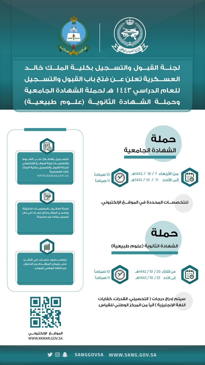أعلنت كلية الملك خالد العسكرية ممثلة في لجنة القبول والتسجيل بوزارة الحرس الوطني عن دورة الضباط للجامعيين وفتح القبول لحملة الثانوية .