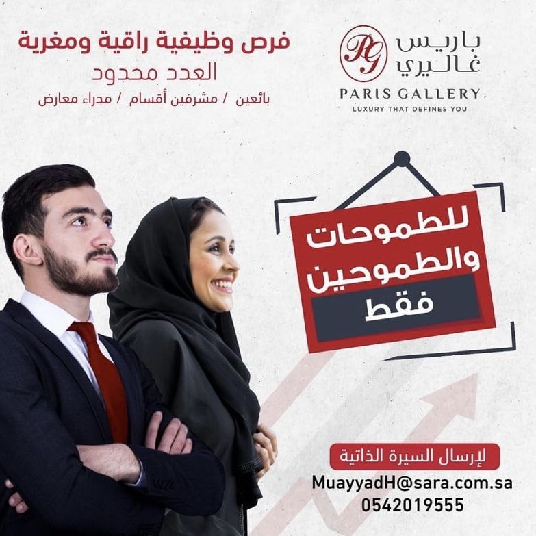 أعلنت متاجر باريس غاليري عن فتح باب التوظيف للرجال والنساء بجميع فروعها بالمملكة واشترطت الشركة أن يكون المتقدم/ـة سعودي الجنسية .
