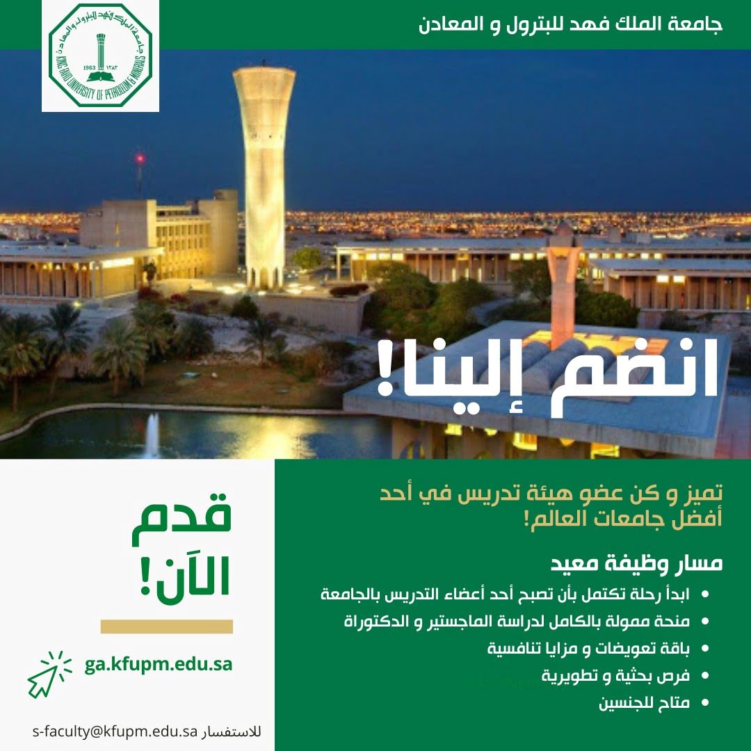 أعلنت جامعة الملك فهد للبترول والمعادن فتح باب التوظيف للجنسين لحملة البكالوريوس على رتبة معيد، تشمل ابتعاث لإكمال الدراسات العليا والالتحاق كأعضاء هيئة تدريس في كليات الجامعة.