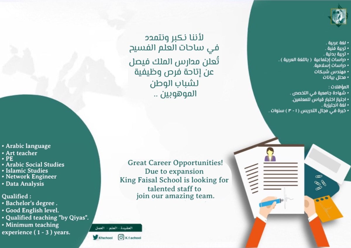 فتح باب التوظيف للوظائف التعليمية والتقنية لدى مدارس الملك فيصل بمدينة
