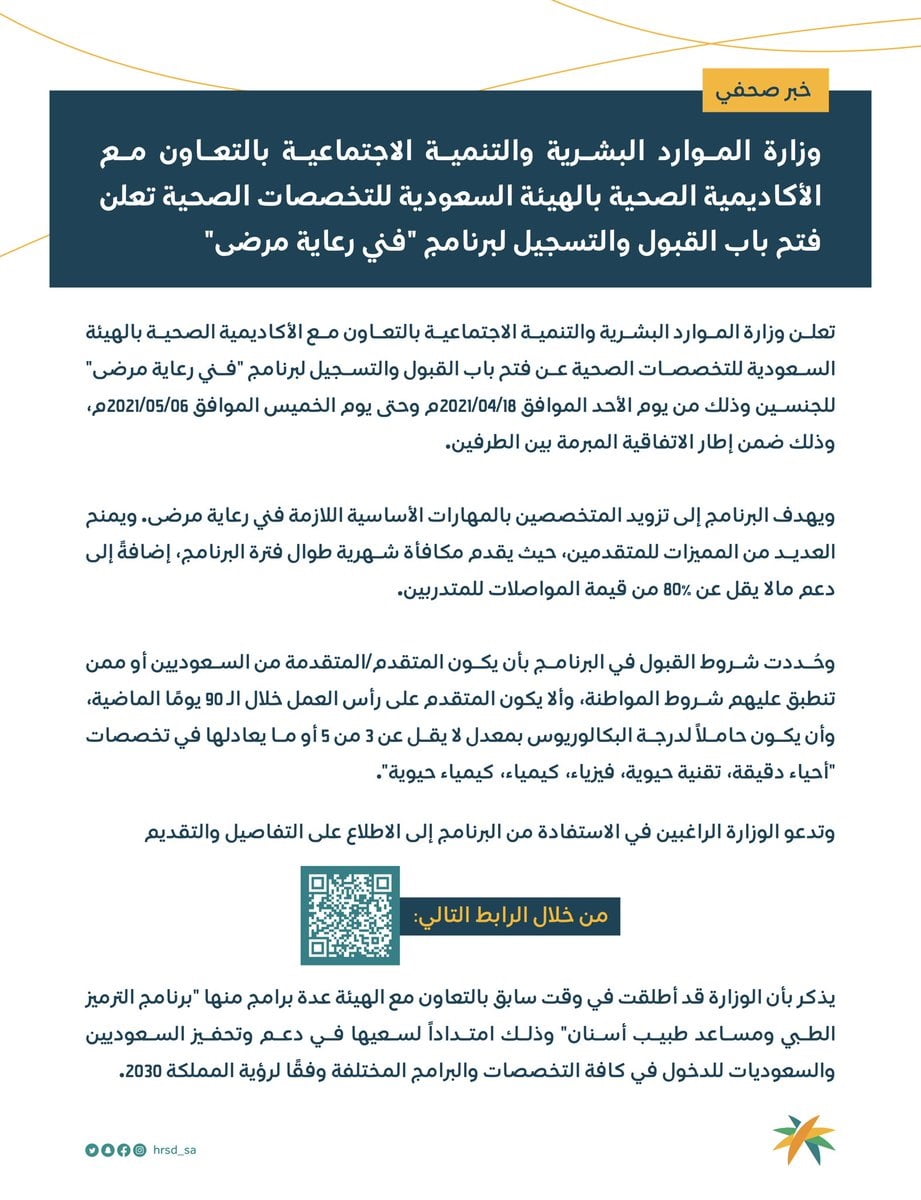 أعلنت وزارة الموارد البشرية والتنمية الاجتماعية بالتعاون مع الأكاديمية الصحية بالهيئة السعودية للتخصصات الصحية تعلن فتح باب القبول والتسجيل لبرنامج فني رعاية مرضى.
