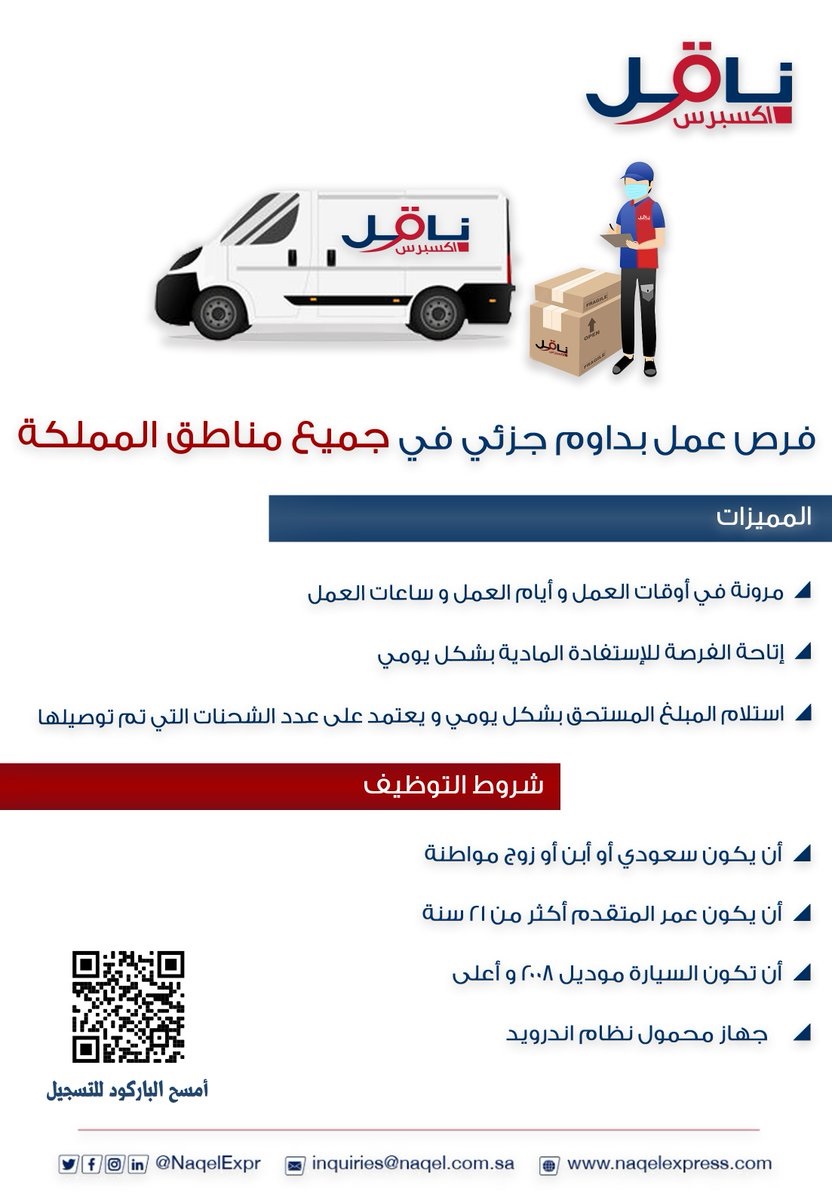 أعلنت شركة ناقل اكسبرس عن توفر فرص عمل دوام جزئي للعمل في جميع مناطق المملكة .