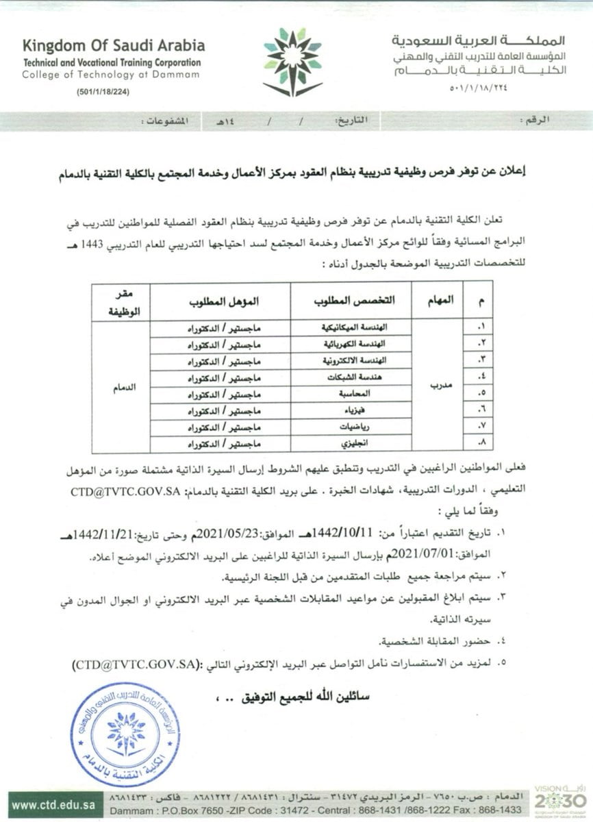 أعلنت الكلية التقنية بمدينة الدمام عن توفر فرص وظيفية تدريبية بنظام العقود للمواطنين للتدريب في البرامج المسائية وفقاً للوائح مركز الأعمال وخدمة المجتمع لسد احتياجها التدريبي للعام التدريبي 1443هـ