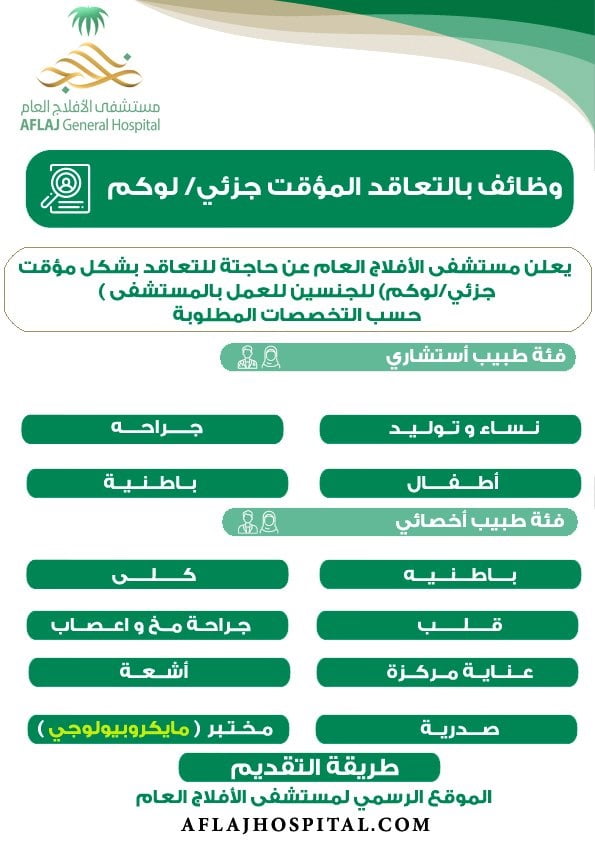 أعلن مستشفى الأفلاج العام عن حاجته للتعاقد بشكل مؤقت جزئي / لوكم للجنسين، للعمل بالمستشفى حسب التخصصات المطلوبة .