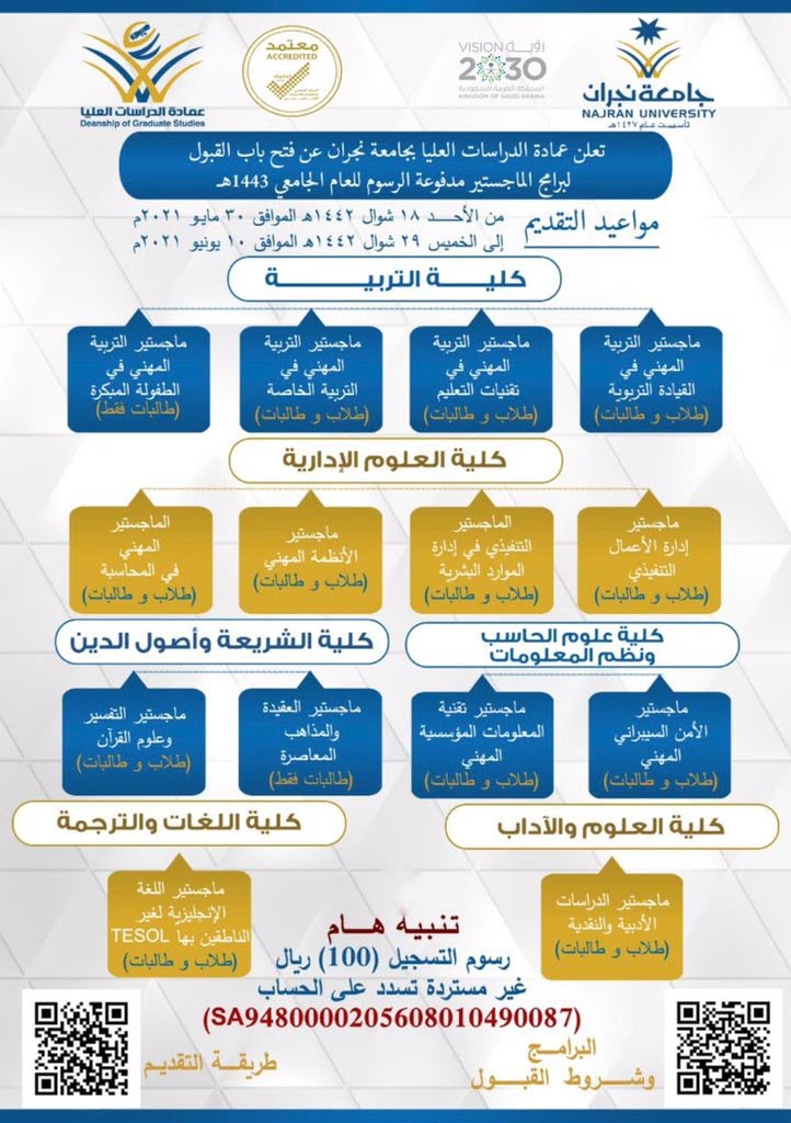 مواعيد القبول في 14 برنامجًا للماجستير مدفوع الرسوم 1443هـ لدى جامعة نجران