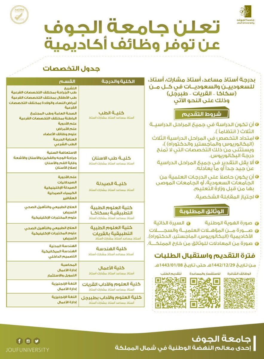 أعلنت جامعة الجوف عن توفر وظائف أكاديمية بدرجة أستاذ مساعد، أستاذ مشارك، أستاذ، للسعوديين والسعوديات في كل من: سكاكا، القريات، طبرجل .