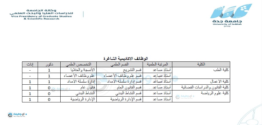 أعلنت جامعة جدة مُمثلة في الإدارة العامة للموارد البشرية توفر وظائف أكاديمية شاغرة للرجال والنساء لحملة الدكتوراه في العديد من التخصصات، للعمل بمسمى أستاذ مساعد، للعام الجامعي 1443هـ، واشترطت الجامعة أن يكون المتقدم أو المتقدمة سعودي الجنسية .