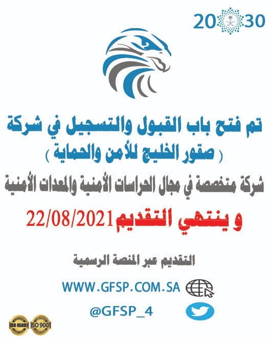 أعلنت شركة صقور الخليج للحراسات الأمنية عن فتح باب القبول والتسجيل للوظائف الإدارية والأمنية جميع مدن ومحافظات المملكة حسب التفاصيل الموضحة أدناه: