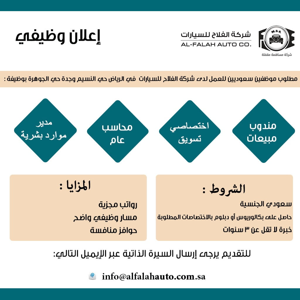 أعلنت شركة الفلاح للسيارات عن توفر وظائف إدارية شاغرة للعمل بفروع الشركة بمدينة الرياض حي النسيم ومحافظة جدة حي الجوهرة .