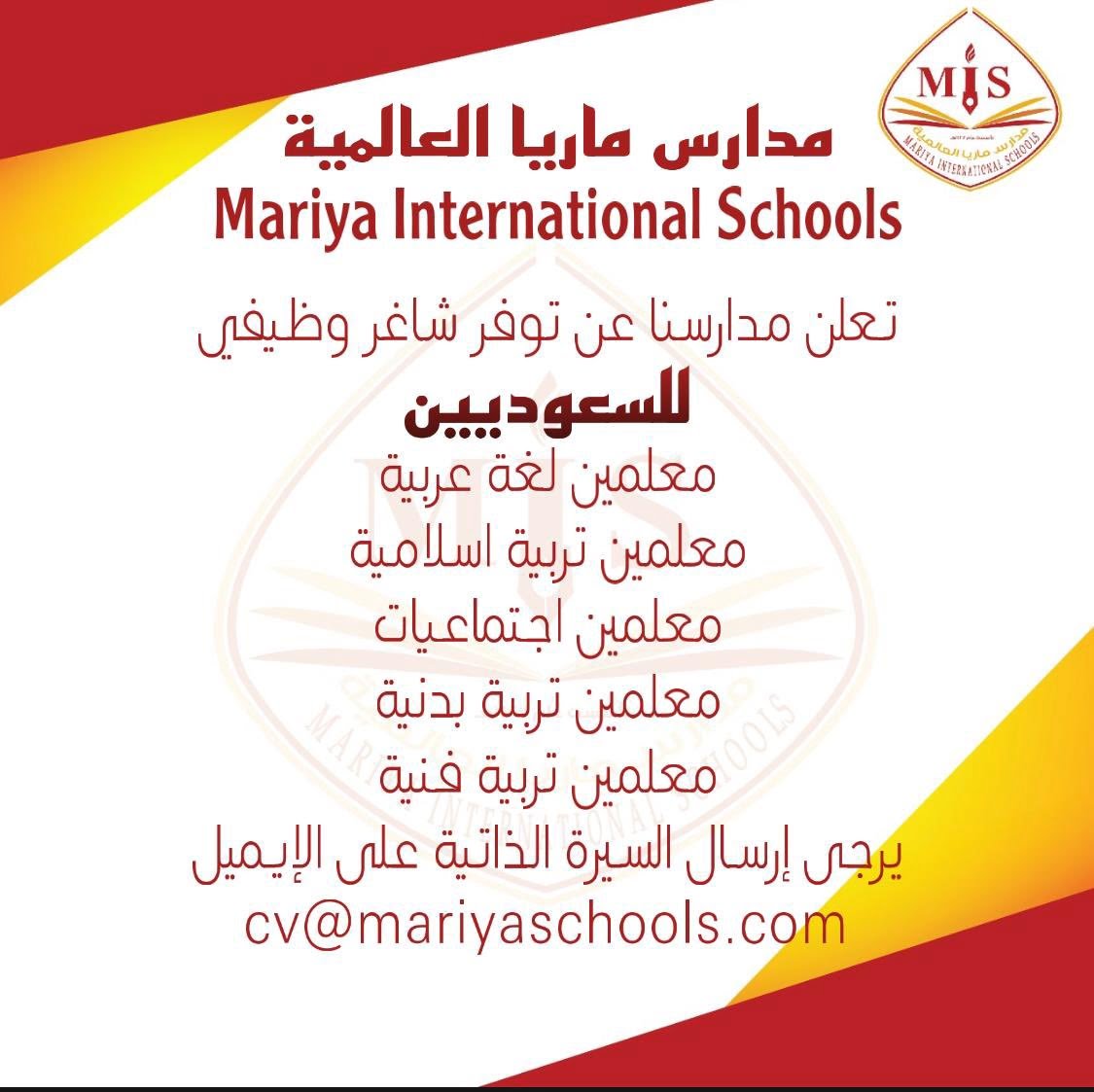 أعلنت مدارس ماريا العالمية في الجبيل توفر وظائف تعليمية شاغرة بقسم البنين للعام الدراسي 1443هـ، للعمل في عدة تخصصات .