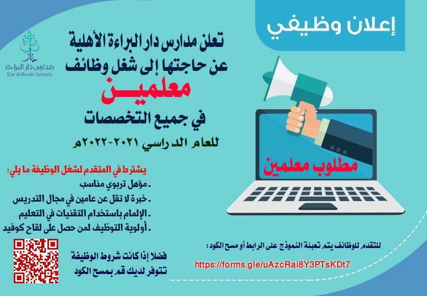 أعلنت مدارس دار البراءة الأهلية توفر وظائف تعليمية معلمين في جميع التخصصات للعام الدراسي1443هـ .