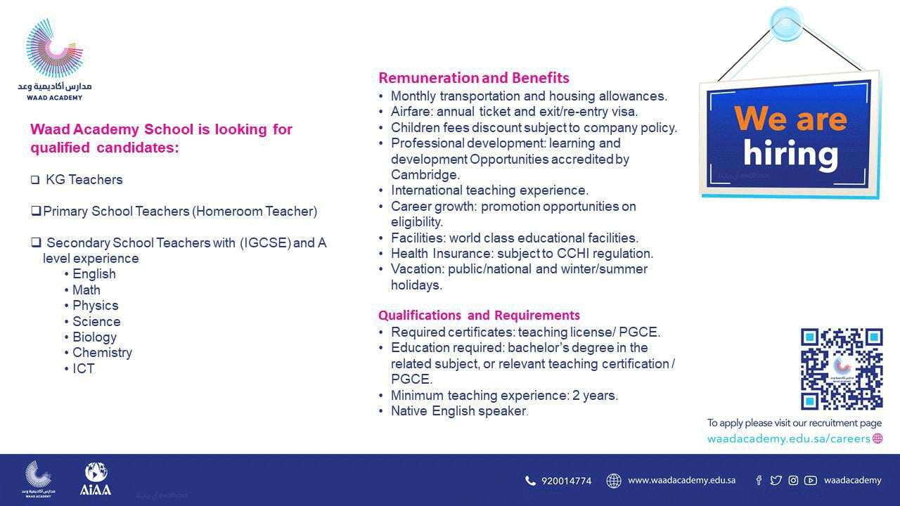 أعلنت مدارس أكاديمية وعد العالمية بمحافظة جدة فتح باب التوظيف للوظائف التعليمية والإدارية للعام الدراسي 1443هـ في جميع التخصصات.