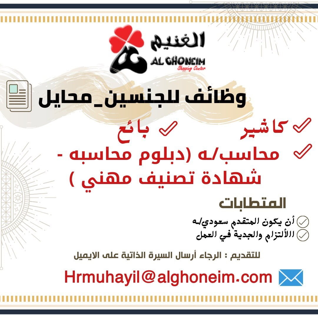 أعلنت شركة الغنيم المحدودة عن توفر وظائف شاغرة للجنسين للعمل في محايل عسير وذلك حسب التفاصيل الموضحة أدناه: