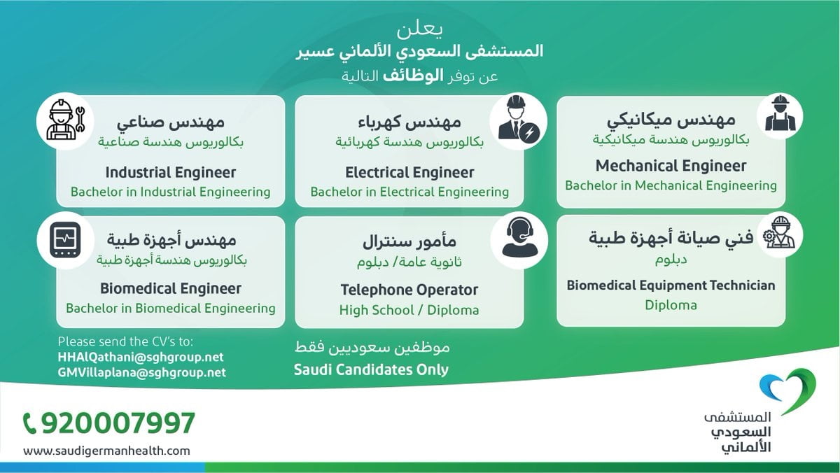 أعلن المستشفى السعودي الألماني عسير توفر وظائف شاغرة لحملة الثانوية العامة فأعلى، واشترط المستشفى أن يكون المتقدم سعودي الجنسية .