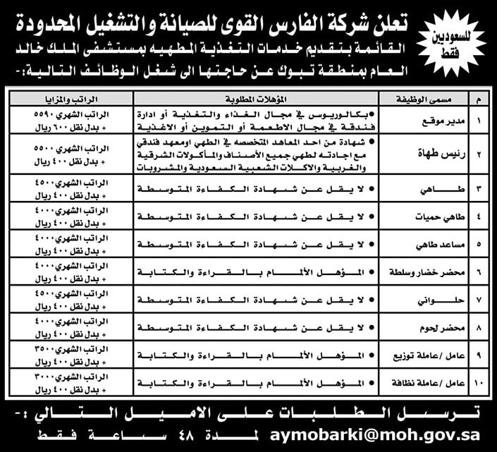 أعلنت شركة الفارس القوي للصيانة والتشغيل المحدودة عن توفر وظائف شاغرة للجنسين بمنطقة تبوك وحائل.
