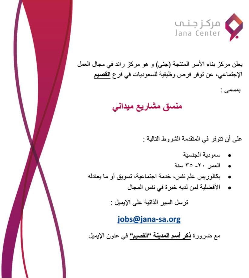 أعلن مركز بناء الأسر المنتجة جنى توفر وظائف لحملة البكالوريوس بالرياض والقصيم.