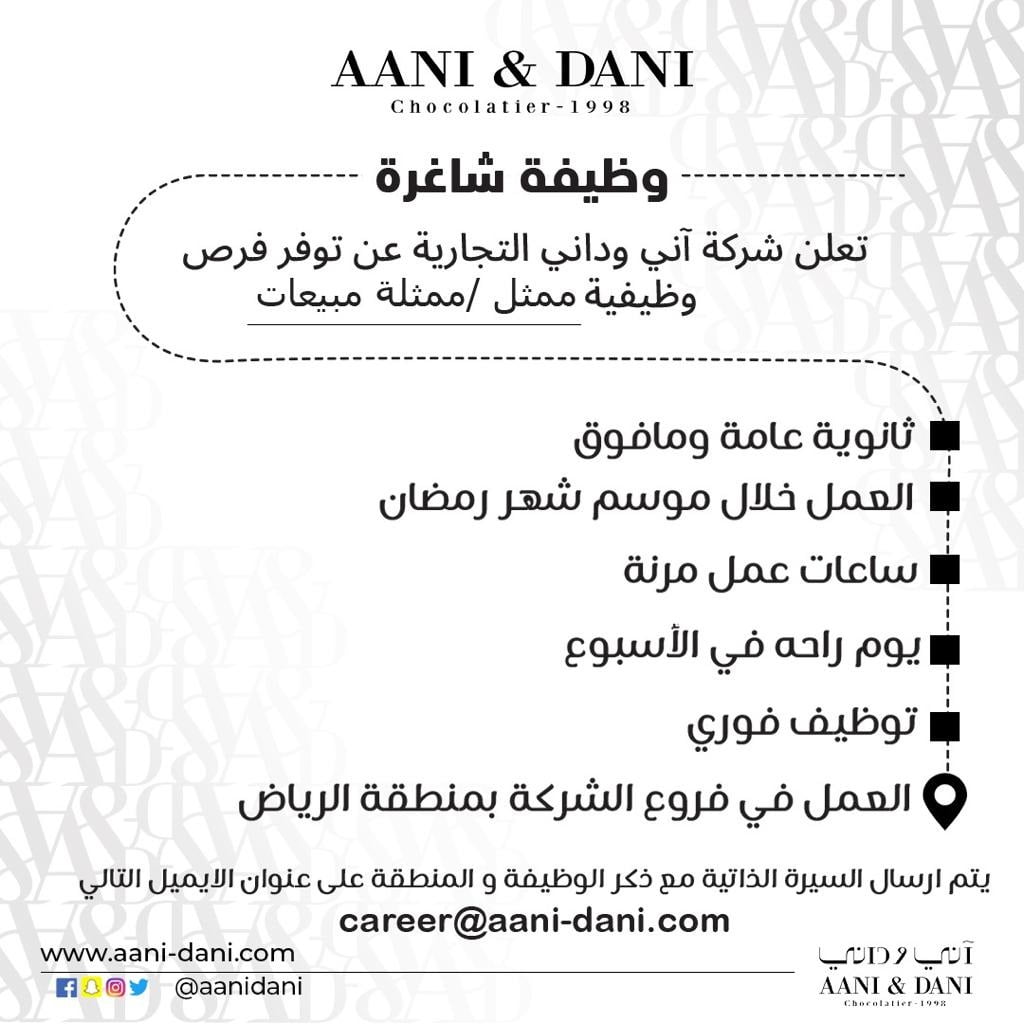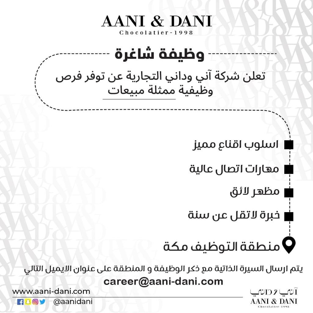 أعلنت شركة اني وداني التجارية عن توفر فرص وظيفية شاغرة بجميع فروع الشركة بمنطقة الرياض ومكة المكرمة .