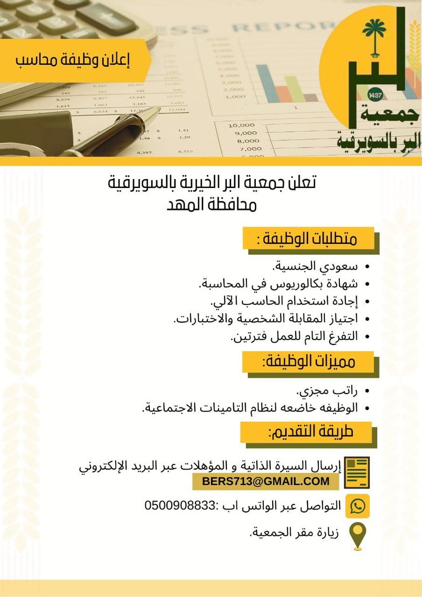 أعلنت جمعية البر الخيرية بالسويرقية محافظة المهد توفر وظيفة إدارية شاغرة لحملة البكالوريوس، للعمل بمسمى محاسب، واشترطت الجمعية أن يكون المتقدم سعودي الجنسية .