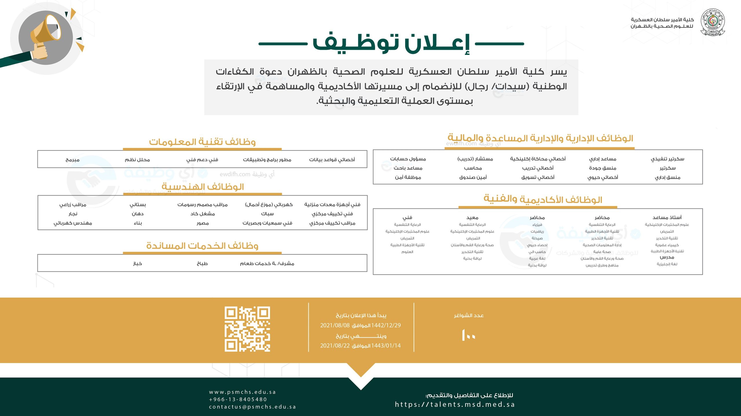 أعلنت كلية الأمير سلطان العسكرية للعلوم الصحية بالظهران توفر 100 وظيفة شاغرة رجال / نساء بعدة مجالات وظيفية، وتدعو الكفاءات الوطنية للإنضمام إلى مسيرتها الأكاديمية والمساهمة في الإرتقاء بمستوى العملية التعليمية والبحثية، وفقاً للتفاصيل الموضحة أدناه.