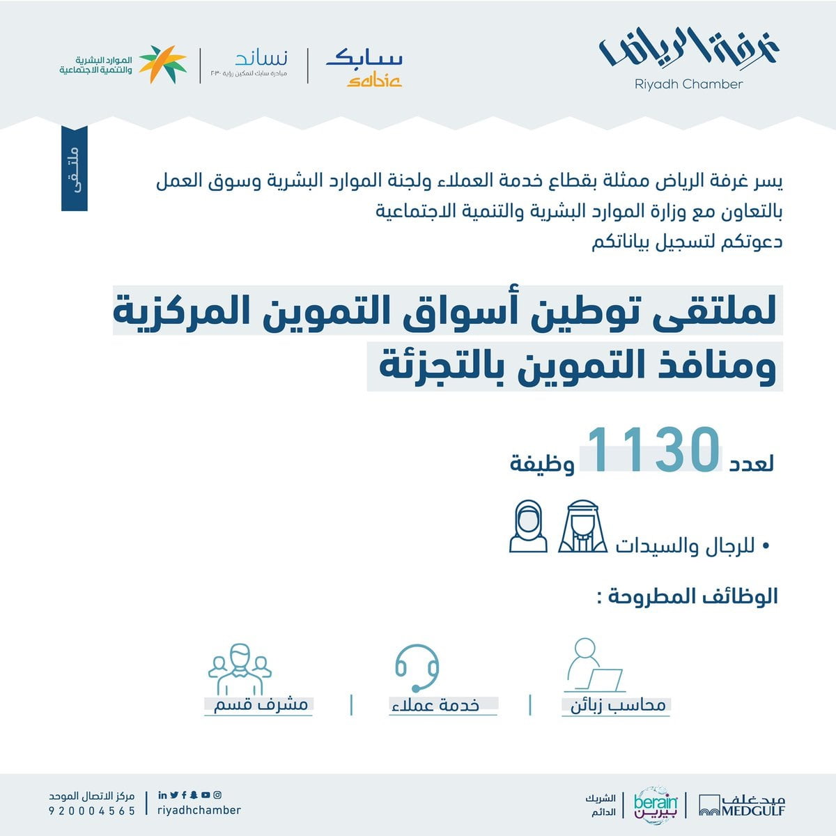 أعلنت غرفة الرياض مُمثلة في قطاع خدمة العملاء ولجنة الموارد البشرية وسوق العمل بالتعاون مع وزارة الموارد البشرية والتنمية الاجتماعية، تدعوكم لملتقى توطين أسواق التموين المركزية ومنافذ التموين بالتجزئة لطرح عدد 1130 وظيفة شاغرة رجال / نساء .