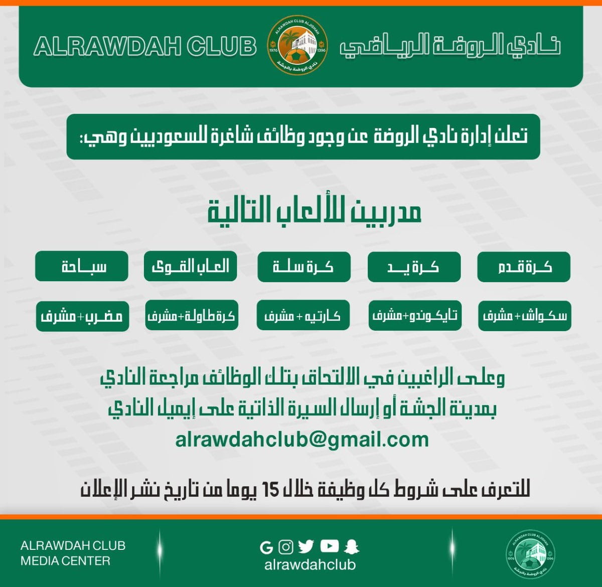 على الراغبين في الالتحاق بتلك الوظائف إرسال السيرة الذاتية إلى البريد الإلكتروني مع كتابة مسمى الوظيفة في عنوان الرسالة. alrawdahclub@gmail.com