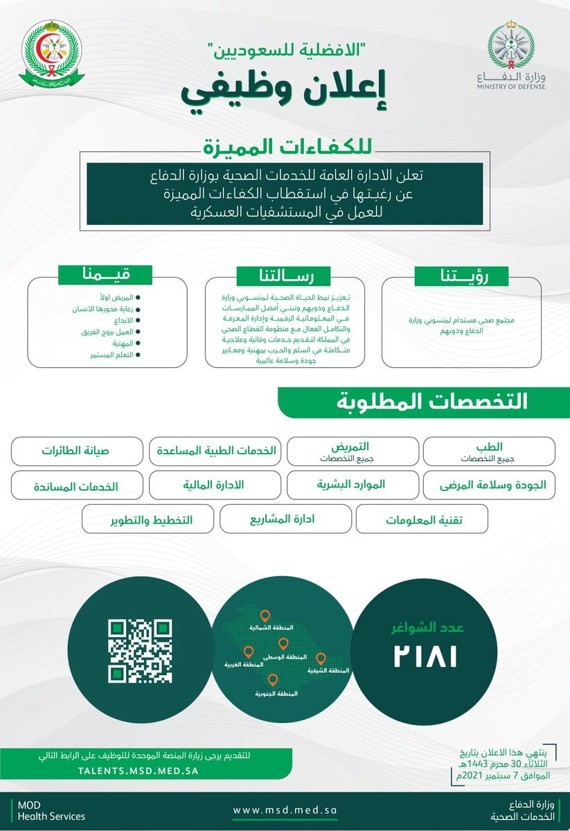 أعلنت وزارة الدفاع عن توفر عدد من الوظائف الشاغرة لإستقطاب الكفاءات المميزة للعمل في المستشفيات العسكرية بالإدارة العامة للخدمات الصحية بوزارة الدفاع حسب التفاصيل الموضحة أدناه: