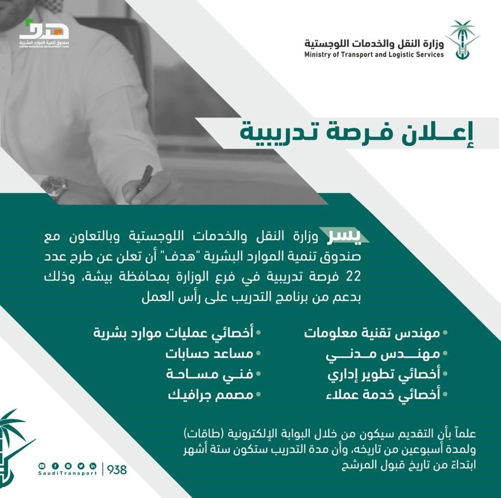 أعلنت وزارة النقل عبر موقعها الإلكتروني 22 فرصة تدريبية شاغرة بمحافظة بيشة، عبر تمهير .