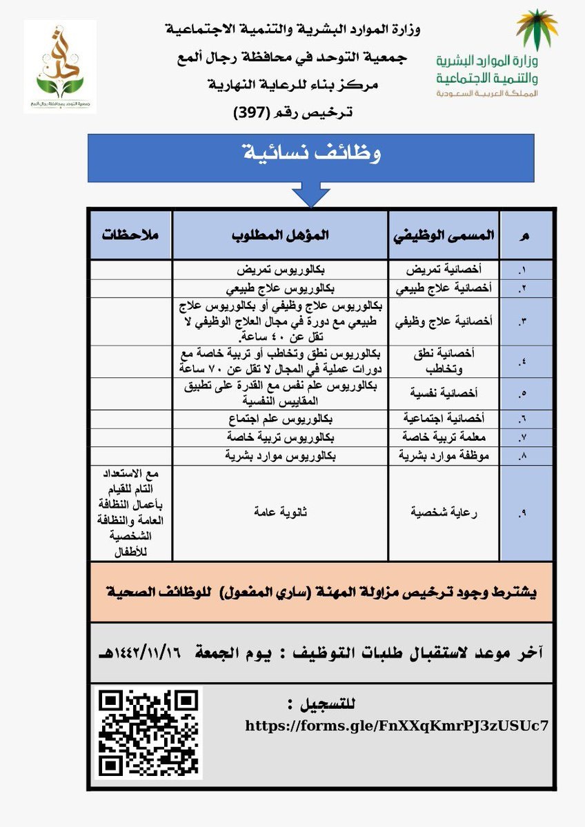 أعلنت جمعية التوحد بمحافظة رجال ألمع توفر 9 وظائف شاغرة لحملة الثانوية فأعلى، للعمل في مركز الرعاية النهارية بناء.