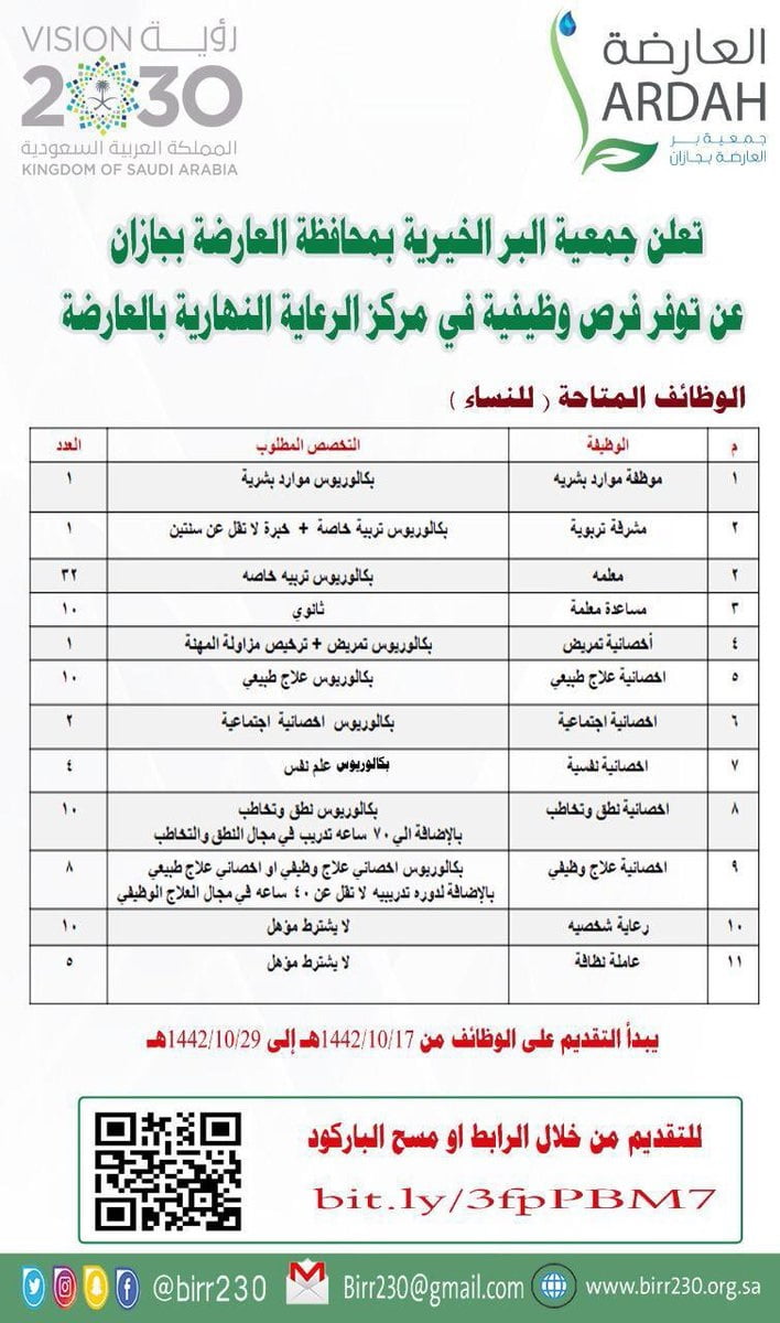 أعلنت جمعية البر الخيرية بمحافظة العارضة بجازان توفر 94 وظيفة تعليمية وصحية وإدارية واجتماعية، واشترطت الجمعية أن تكون المتقدمة سعودية الجنسية أدناه.